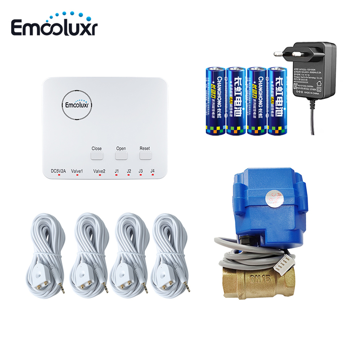 מערכת הגנה מפני דליפת מים צינור: 2pc dn15 (1/2 ") שסתום פליז + 4PC 6m חיישן + יחידת בקרת מים עם סוללות, 5v תקע eu